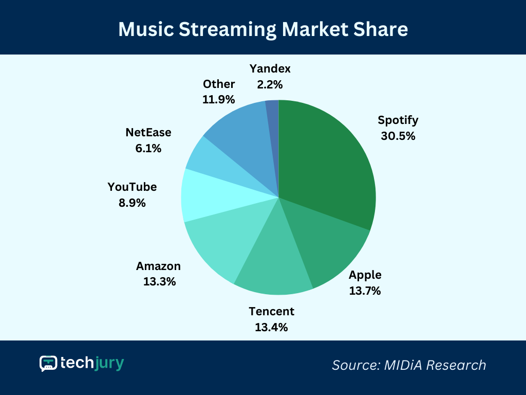 (2 ~ 4위의 애플뮤직, 아마존뮤직, 텐센트뮤직과는 격차가 꽤 있습니다.)